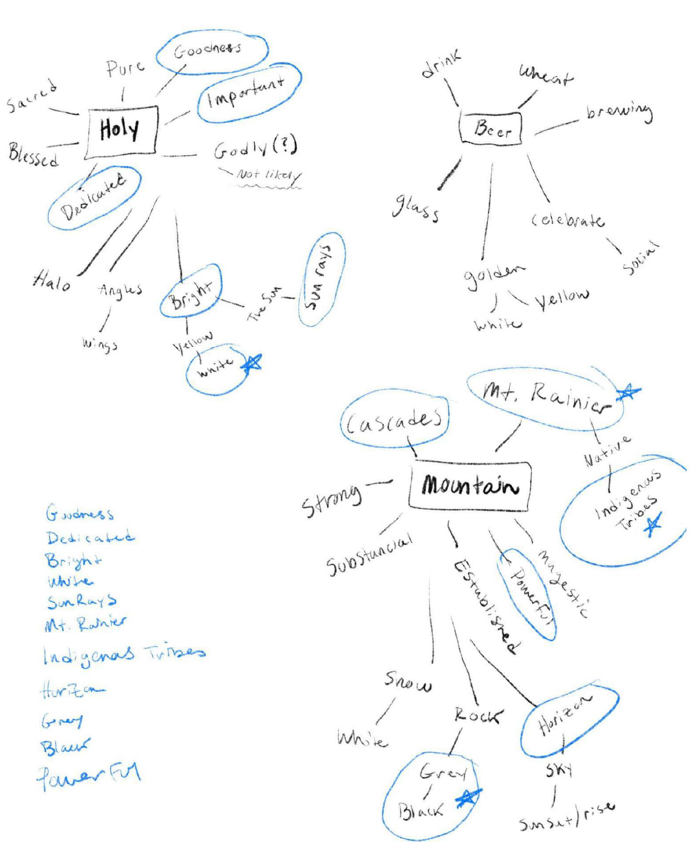 The mind mapping began by focusing on the two words that makeup the company, Holy and Mountain, and finding words that represent them. I also chose to focus on their craft, brewing beer, and found words that represent that. Through this I complied a list of words that I felt identified Holy Mountain Brewing Co. well.