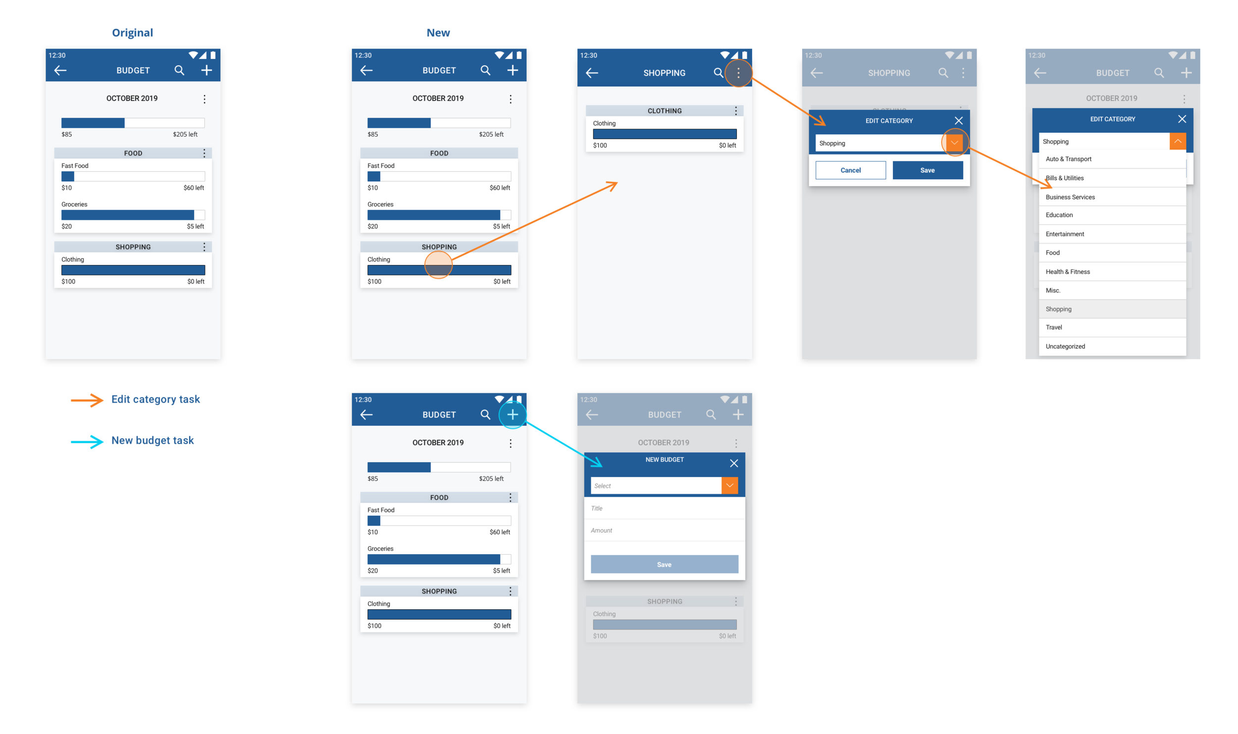 To correct this, I would remove the vertical dot, or“more options” symbol next to FOOD and SHOPPING. The user will tap on SHOPPING, and they would be directed to a page displaying all of the budgets they have under that category. Back at the BUDGET page, there is now a higher chance that the user will tap the “add” symbol to create a new budget.